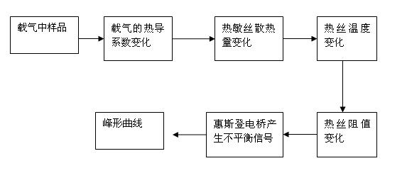 TCD的热导池块系在一金属物体,内加工对称的两个腔室,装一组热敏元件(热敏元件选用电阻率和电阻温度系数大的金属丝或半导体热敏元件),两个腔室其一为参比池,另一为测量池。 TCD参比池仅通过载气气流,从色谱柱溜出的组分由载气携带进入测量池,参比池与测量池的热敏元件分别安在惠斯登电桥相邻的两个臂里,电桥由直流稳压电源或直流稳流电源供电,电桥的不平衡输出经分压器分压,最后由记录仪加以记录。